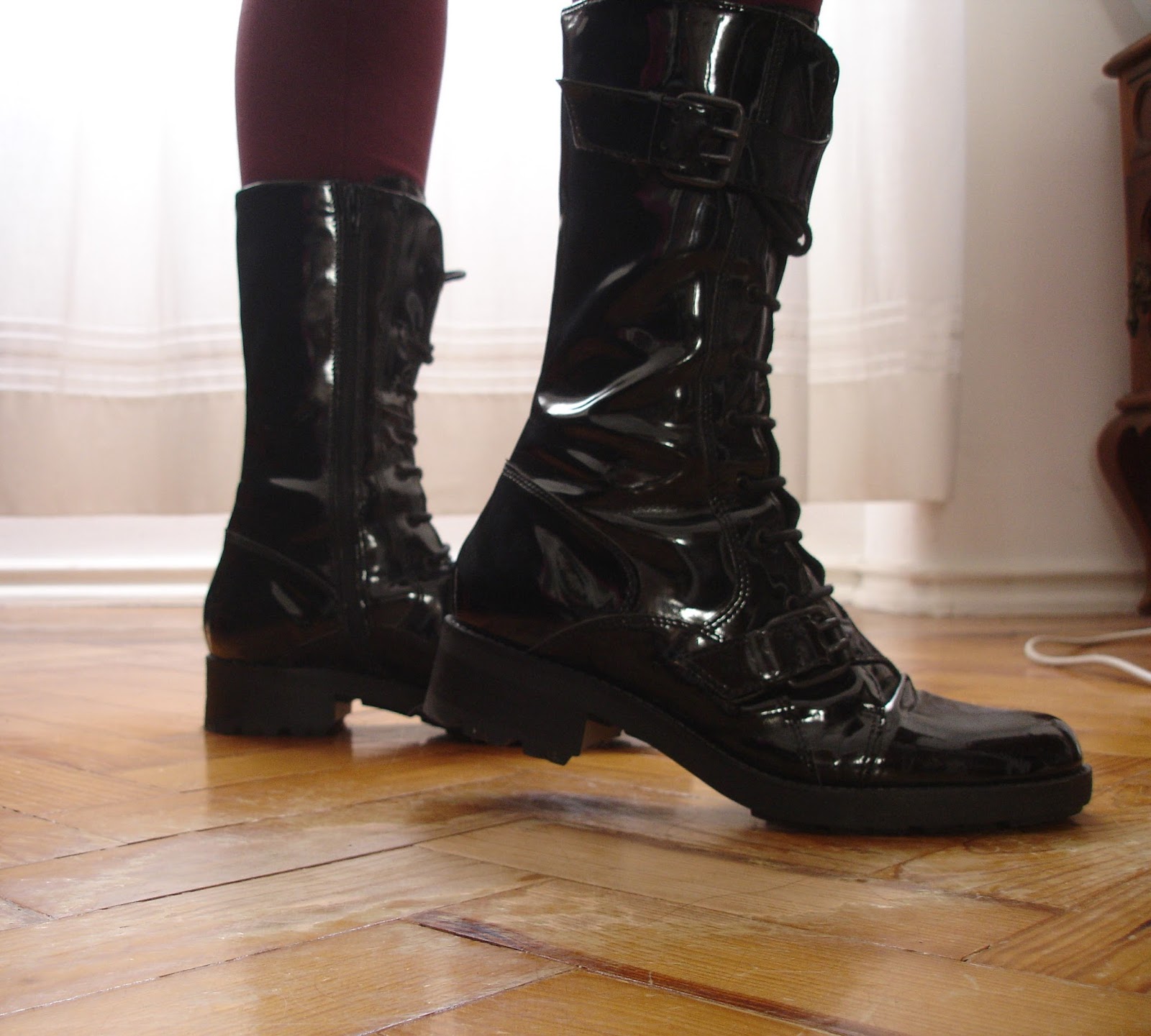As botas em vinil preto, estilo gótico / punk / metal / UK. Adquiridas numa loja Benetton, mas não traziam etiquetas da marca. Têm duas fivelas ajustáveis, uma em baixo e outra em cima. Atacadores, com 7 furos. Os furos são espaçados e as botas têm o cano mais alto que as 8 furos normais (nas fotos dá para ver como ficam). Uma vez ajustado o tamanho são muito práticas de calçar e descalçar, pois possuem fecho ao longo de todo o comprimento, do lado de dentro.